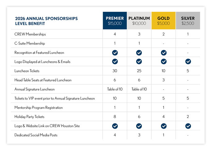 When you sponsor CREW Houston, you are directly supporting the advancement of women in commercial real estate, while influencing the growth and success of the Houston, Texas, CRE industry